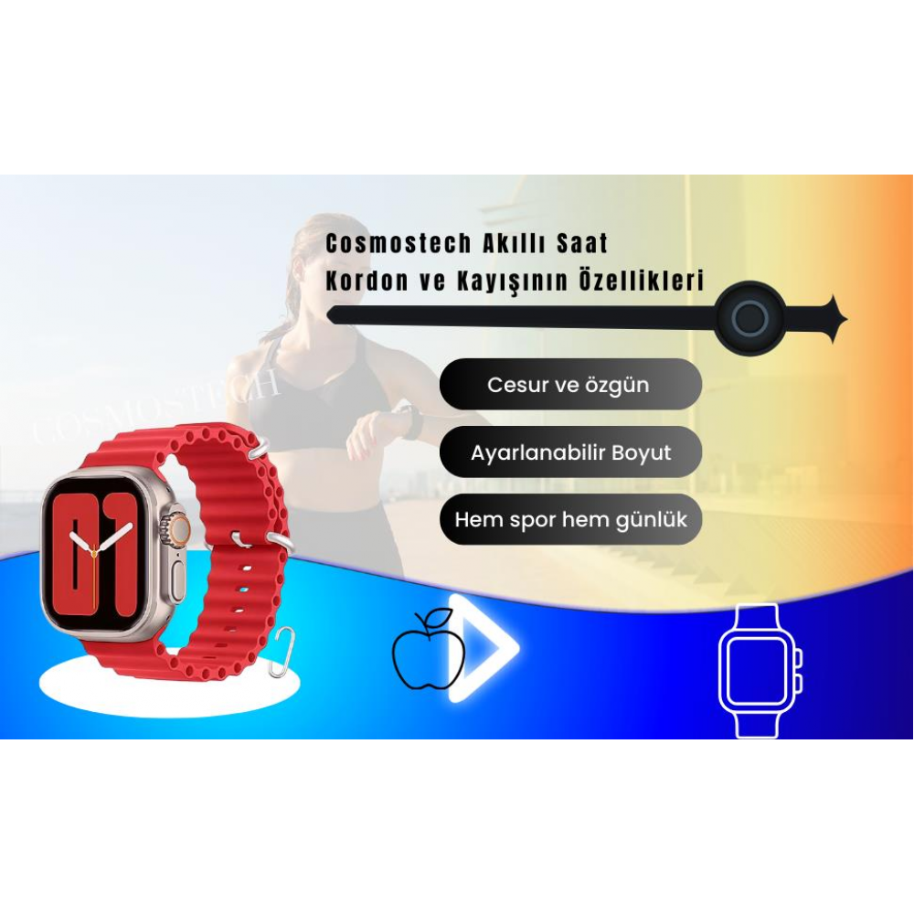 Cosmostech Akıllı Saat için sunulan bu özel silikon kordon ve kayış, saatinizin tarzını ve rahatlığını geliştirmek için tasarlanmıştır. Ürün, 42MM, 44MM, 45MM, 49MM gibi farklı saat boyutlarına ve 1, 2, 3, 4, 5, 6, SE, 7, 8, Ultra gibi farklı akıllı saat modellerine uyum sağlar. Bu çeşitlilik, size saatinizi kişiselleştirme ve güncelleme konusunda geniş bir esneklik sunar.
